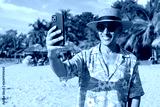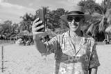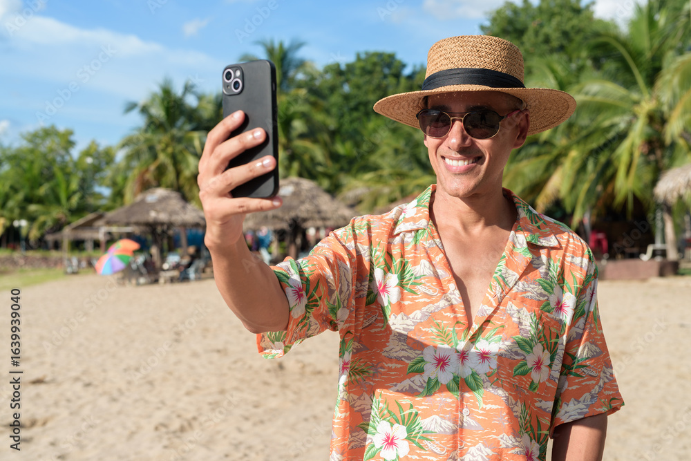 Hispanic Male Tourist in Panama Hat and Tropical Shirt Summer Vacation at Beach Using Phone