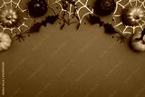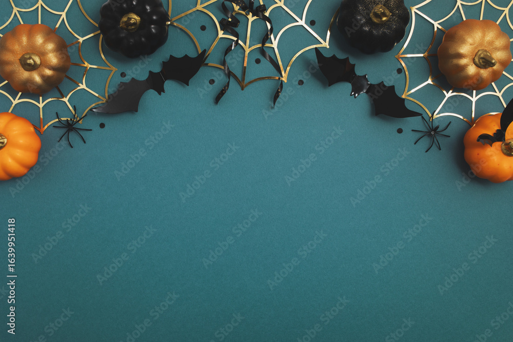 Halloween holiday background with party decorations of pumpkins, golden spiderweb and bats on dark blue table top view. Happy halloween greeting card in flat lay style.