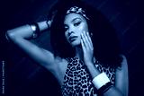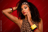 Glamorous young woman with bold makeup and leopard print top in stylish retro setting on red background