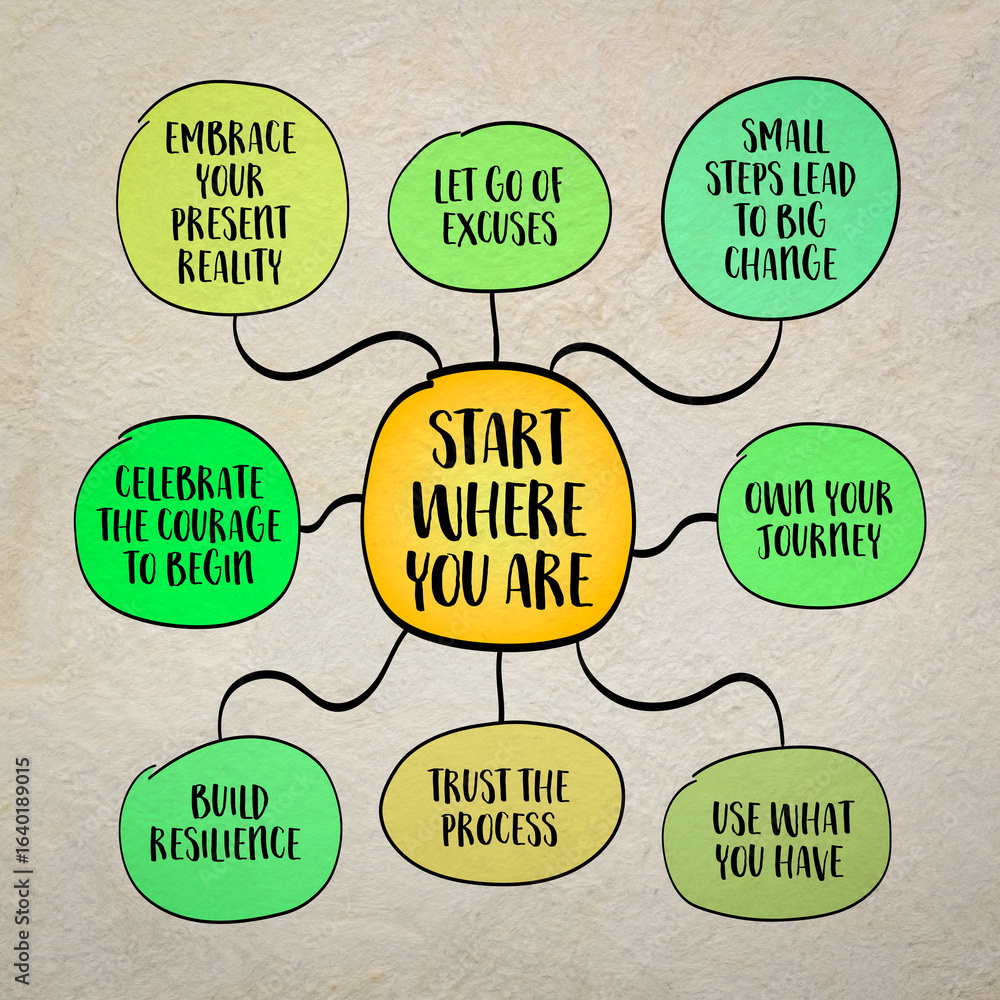 Start where you are, a powerful reminder that progress doesn't require perfection, ideal conditions, or waiting for a better time. Inspirational infographics mind map sketch.