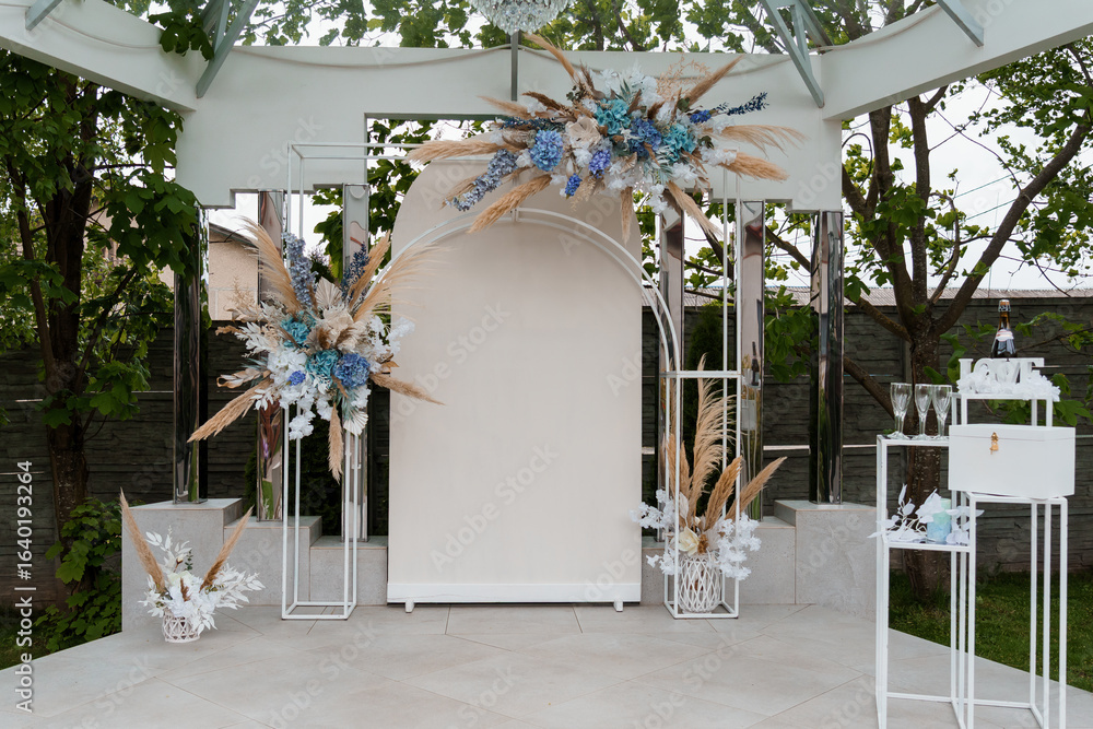 Elegant Wedding Arch Backdrop with Pampas Grass and Blue Hydrangeas in Outdoor Ceremony Setting, White and Pastel Color Scheme.