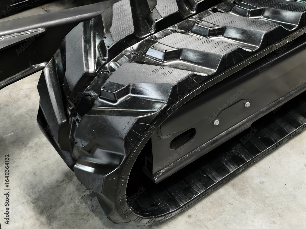 Close-up view of construction machine track components showcasing unique tread design and robust material features in a workshop setting