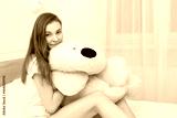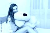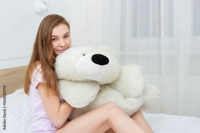Beautiful teenager hugging soft teddy bear and smiling lying in her bed in the bedroom