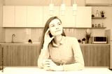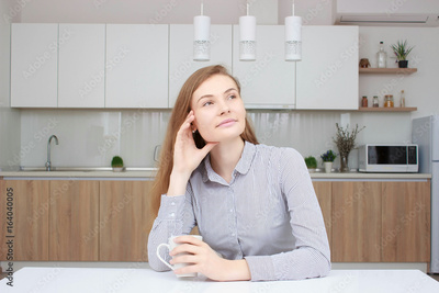 Beautiful cheerful young worker holding coffee cup and looking away with smile talking by phone in morning