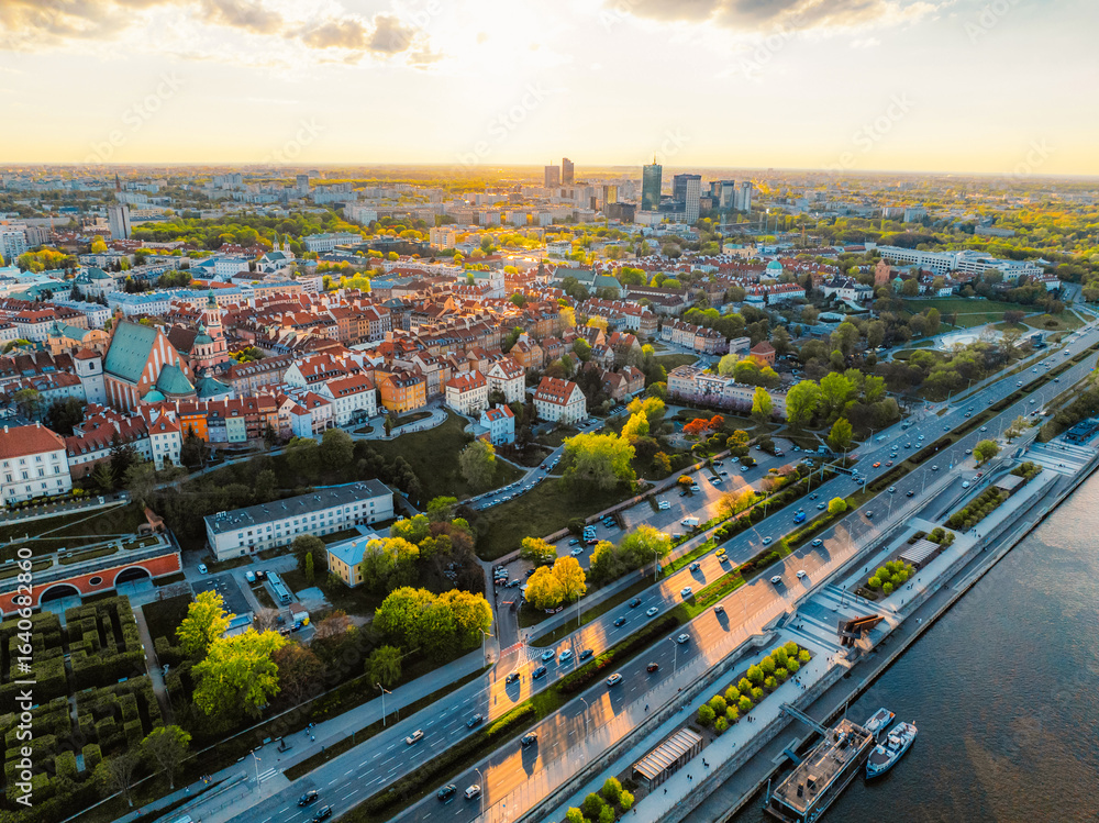 Warsaw old city center and skyscrapers in the background Vistula river. Sunset in Warsaw city center aerial view.