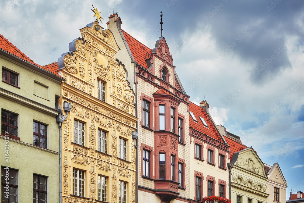 Facades of old houses in Torun old town, Poland.