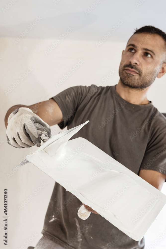 Craftsman in dirty gloves and grey shirt puts plaster on hawk with trowel, closeup. House construction