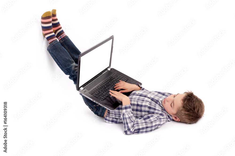 Young nerd boy lying on floor using a laptop with empty white screen.