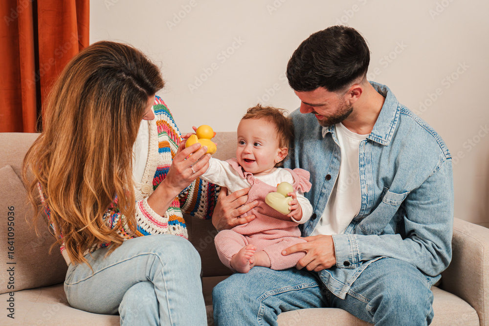 A joyful family engaged in playful activities with their baby, sharing laughter and happiness with colorful toys that create memorable moments of love and bonding during their cherished time together.