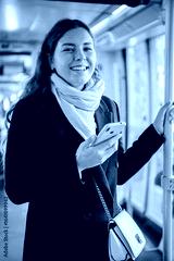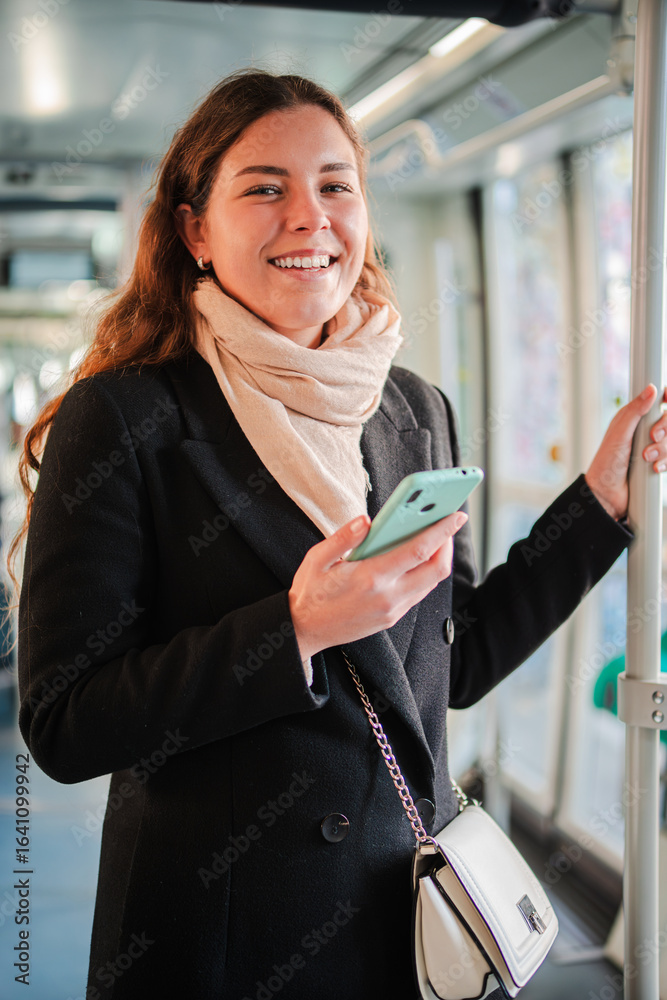 Happy female passenger joyfully using her smartphone to browse the internet while commuting on public transport, embodying a spirit of connectivity and engagement with modern technology in a lively