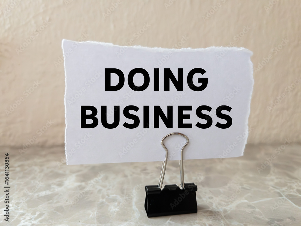 Doing business message written on ripped torn white paper piece on wall background. Conceptual doing business symbol. Copy space.
