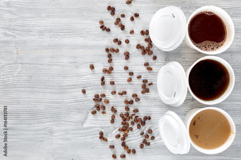 Coffee to go. Coffee cups with cover and coffee beans on wooden table backound top view copyspace