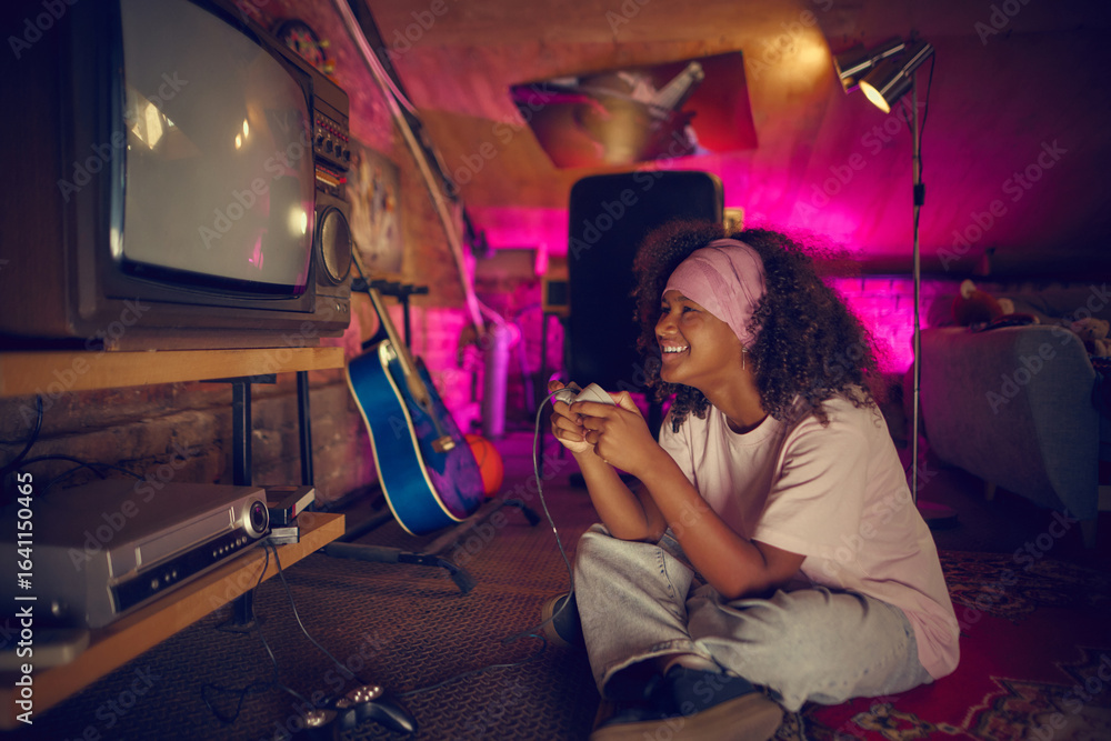 Teen girl enjoys gaming on vintage console, sitting on carpet near old TV in cozy attic with pink ambient light. Concept of gamer nostalgia and carefree youth.