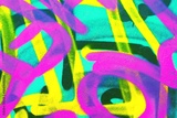 Graffiti-inspired abstract art in neon purple, yellow, turquoise. Vibrant Y2K style, energetic lines, street art vibe. Posters, digital art, modern 2000s, creative banner.