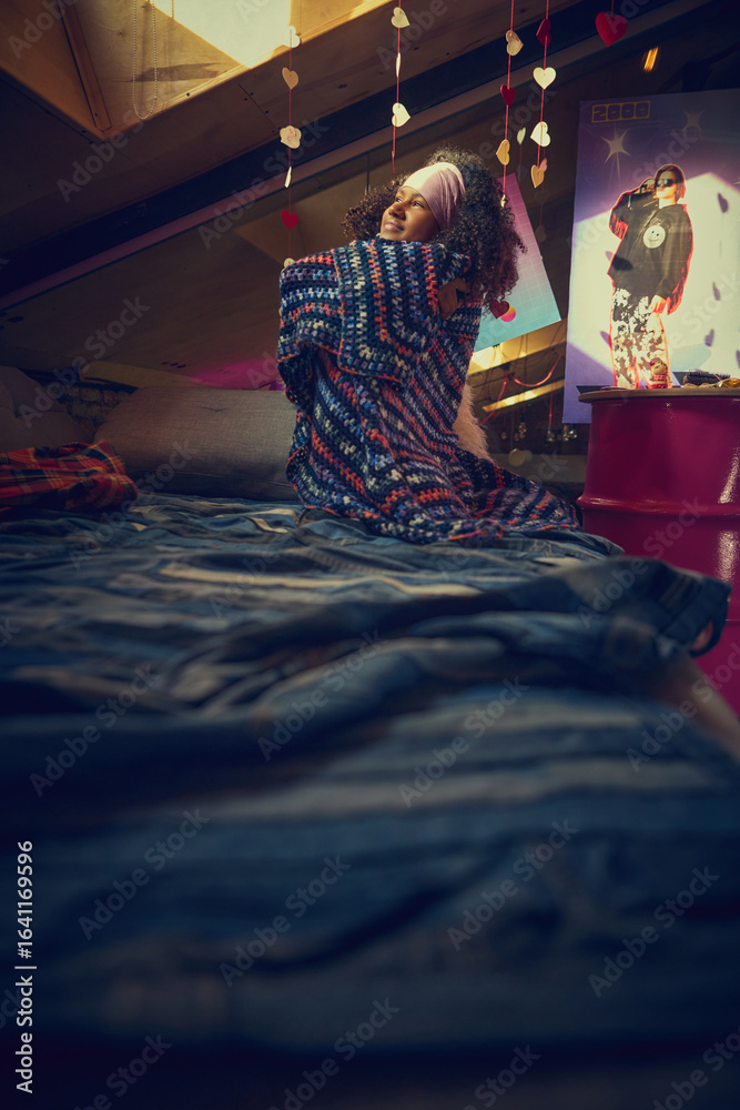 Teen girl sits on bed wrapped in colorful knitted blanket, gazing softly toward light in cozy retro attic room. Concept of comfort, daydreaming, and teenage personal space.