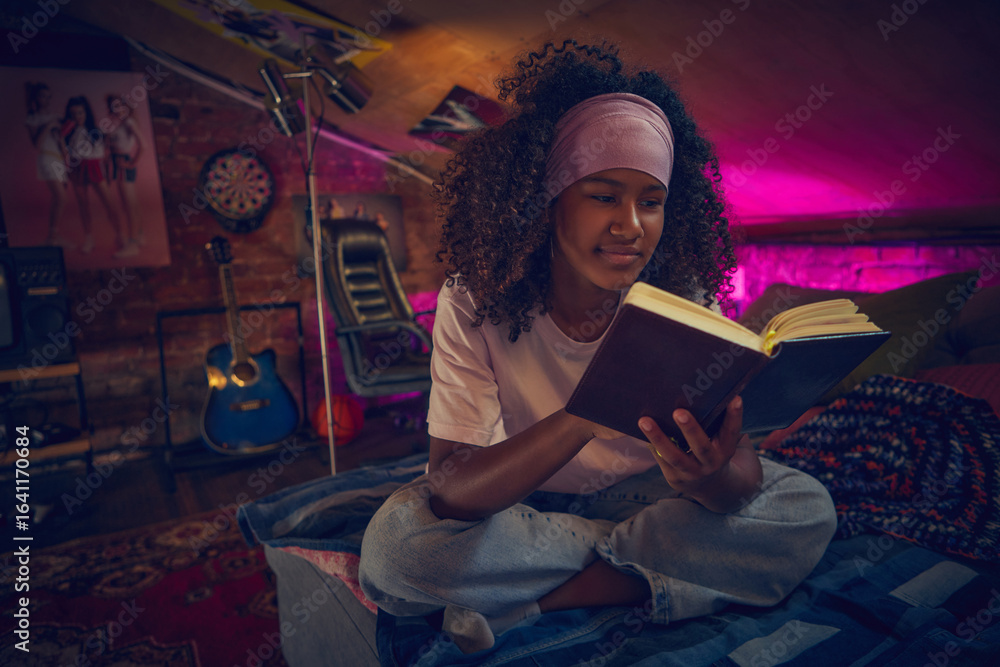 Teen girl sits cross-legged on bed, focused on reading in dimly lit attic with guitar and posters. Concept of education, inspiration, and creative thinking in a warm nostalgic space.