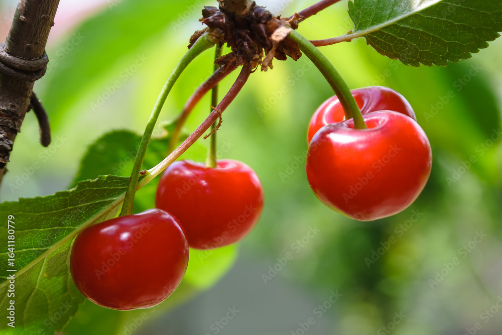 delicious red cherries in the countryside garden. fresh organic cherry in summer. ripe sweet fruit among green leaves on the branch. raw juicy food full of vitamin
