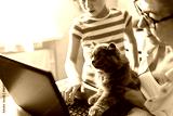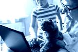 Family and cat browsing on laptop. Working mother, child at home. People and animal watching video. Technology lifestyle. Woman and kid have fun together. Vet telehealth, digital pet care, insurance