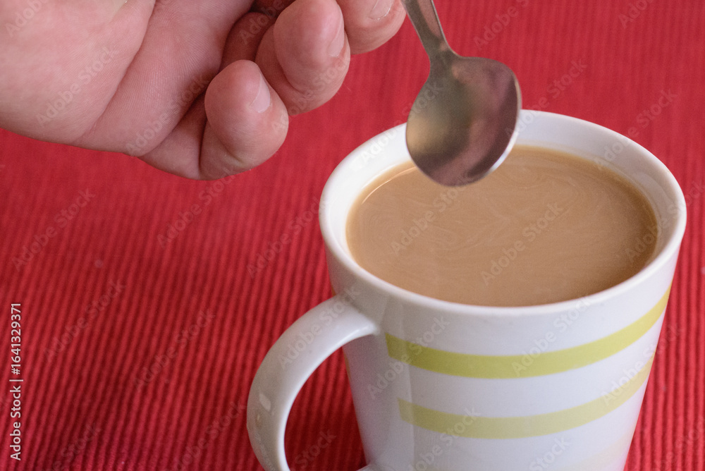 Stirring coffee in a white mug on a red tablecloth during morning routine at home