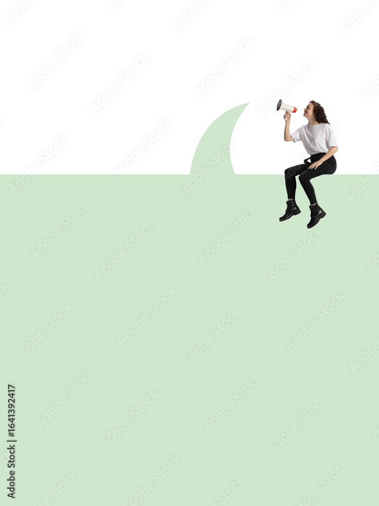 Bright collage of woman with megaphone sitting on large green speech bubble against white background. Concept of public speaking, announcement, and advertising with ample copy space.