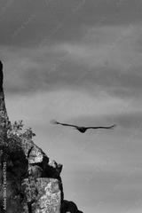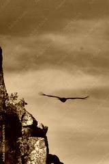 Buitre leonado volando cerca de las rocas de un acantilado, ave rapaz y carroñera en libertad en su hábitat natural de la península ibérica