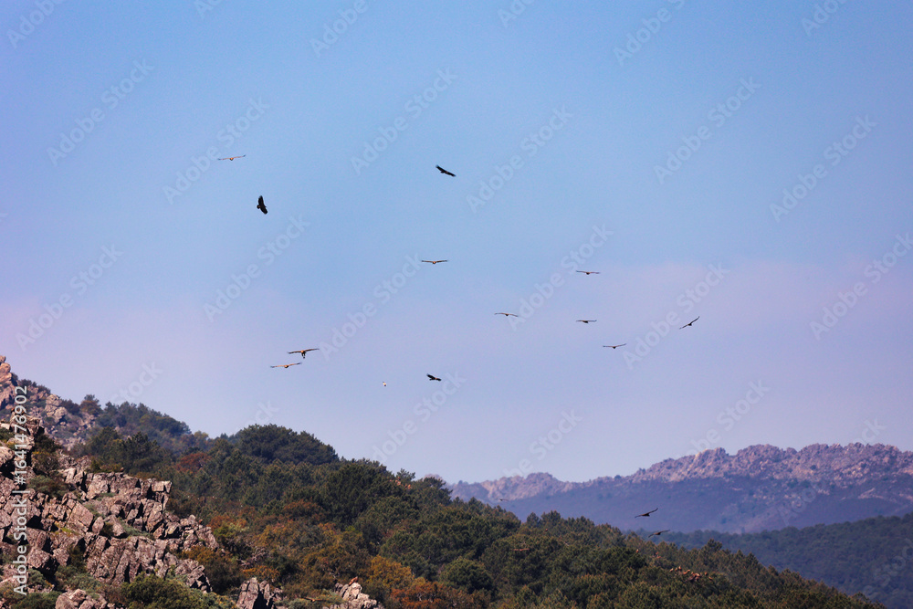 Grupo de buitres leonados sobrevolando las rocas de los acantilados, aves rapaces y carroñeras en libertad en su hábitat natural ibérico