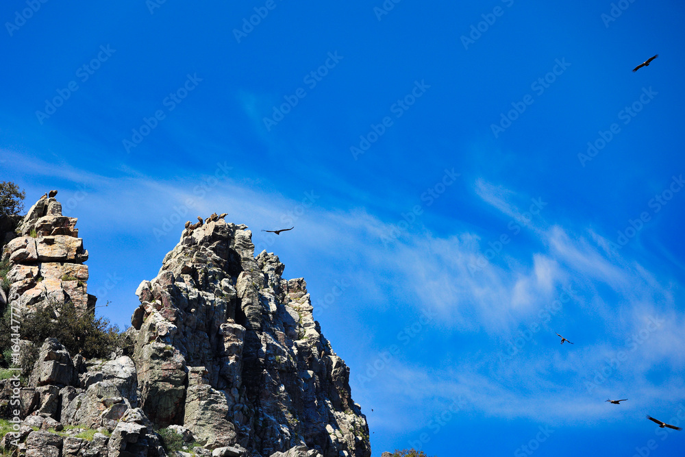 Grupo de buitres leonados sobrevolando las rocas de los acantilados, aves rapaces y carroñeras en libertad en su hábitat natural ibérico