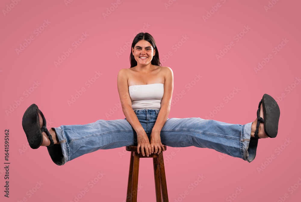 Young woman posing on stool during photoshoot with fan and lighting equipment