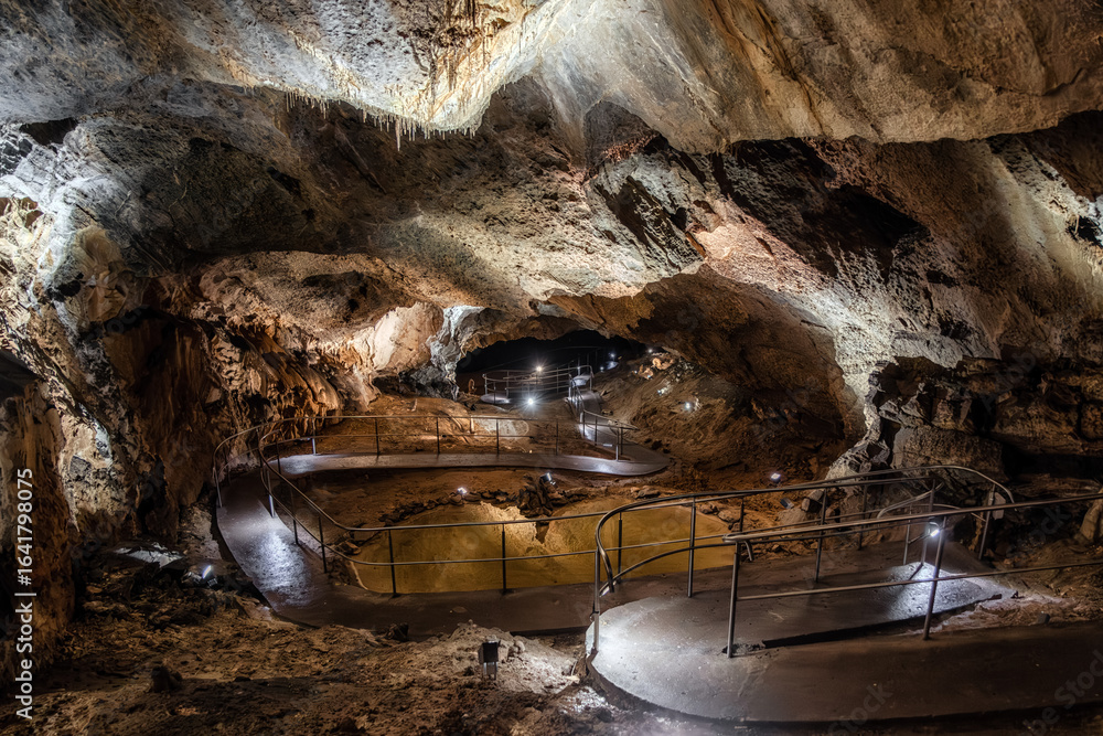 Illuminated interior of Belianska Cave in High Tatras mountains Slovakia with stalactites rock formations and tourist pathway
