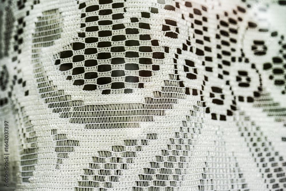 Detailed close up of white lace curtain.