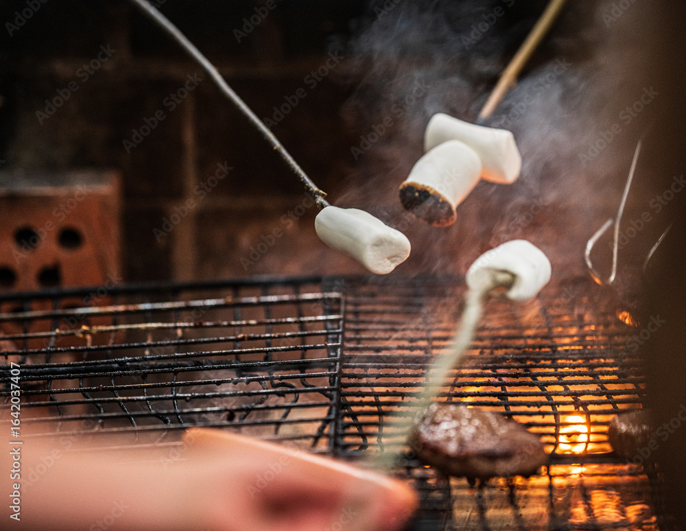 Marshmallows roasting on open flame grill.