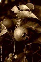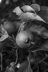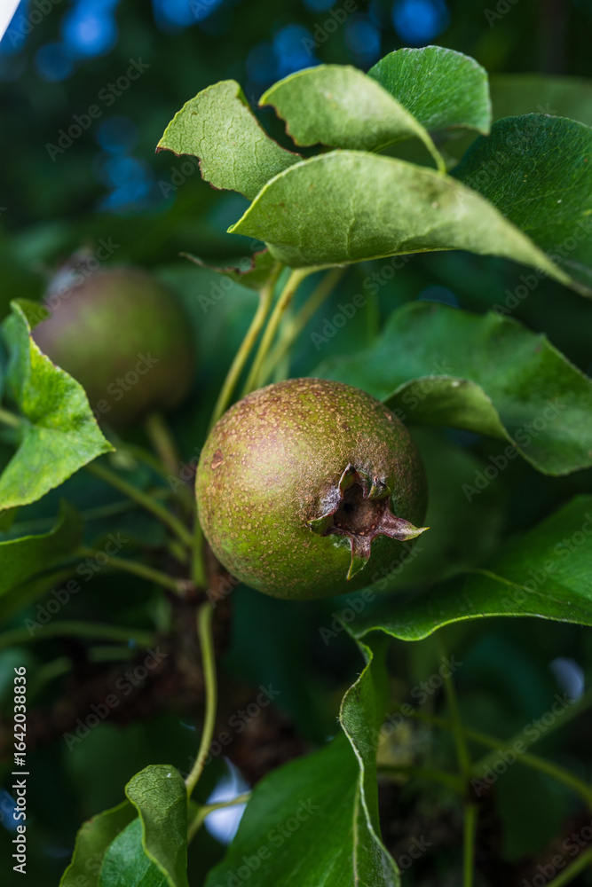 Macro shot of young unripe pear on tree.