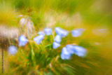Blurred closeup of delicate blue wildflowers in green grassy meadow with soft light