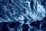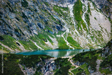 Mountain lake at the base of steep rocky slopes with green patches and a small waterfall