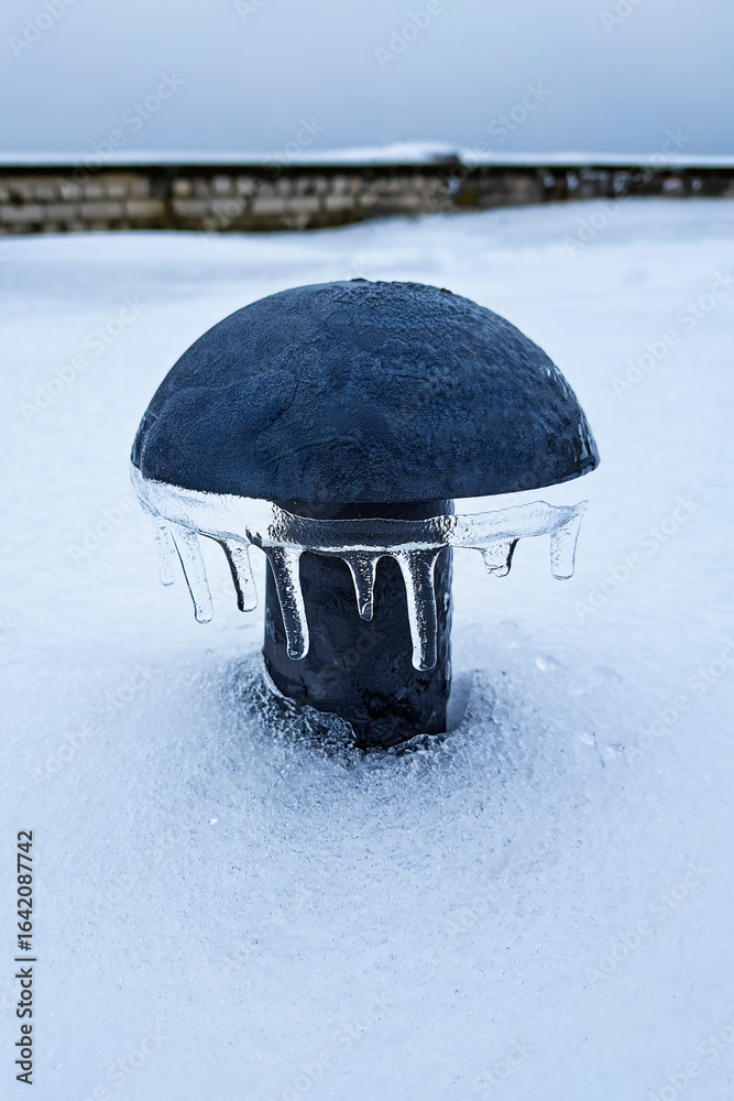 Black plastic air vent, mushroom shaped air vent in winter in snow and icicles on the roof of a building. Abstract natural background.