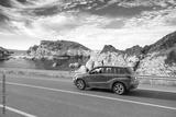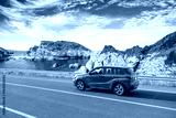 Red car drive on the road of mediterranean beach. driving on coast of France. Highway view on coast on way to summer holiday. Europe travel trip in sea coast road landscape. holiday journey on nature