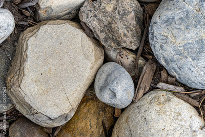 shallow focus background of assorted rocks and wood bits in various colors and textures, flat lay or top view