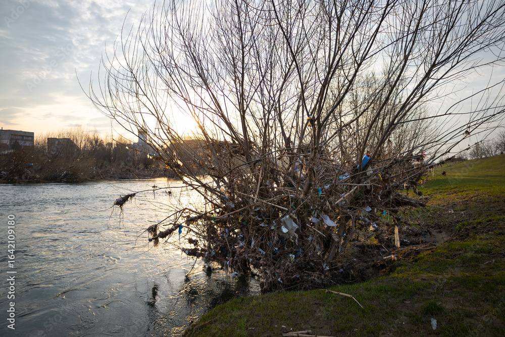 Coast and plastic bottles garbage river after flood. Pollution and environmental protection.