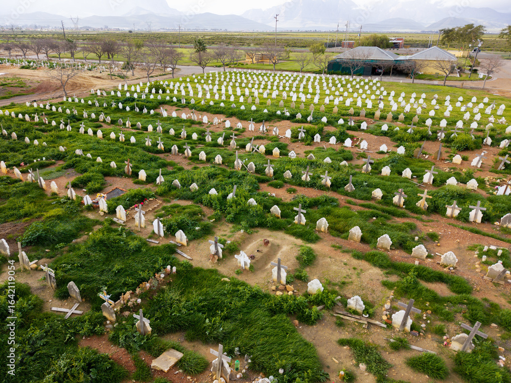 Aerial of cemetery with open grave