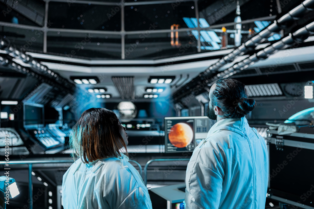Team of cosmonauts in spaceship exploring deep space, doing Mars expedition for future of mankind. Space station colleagues exploring red planet to support human life beyond Earth