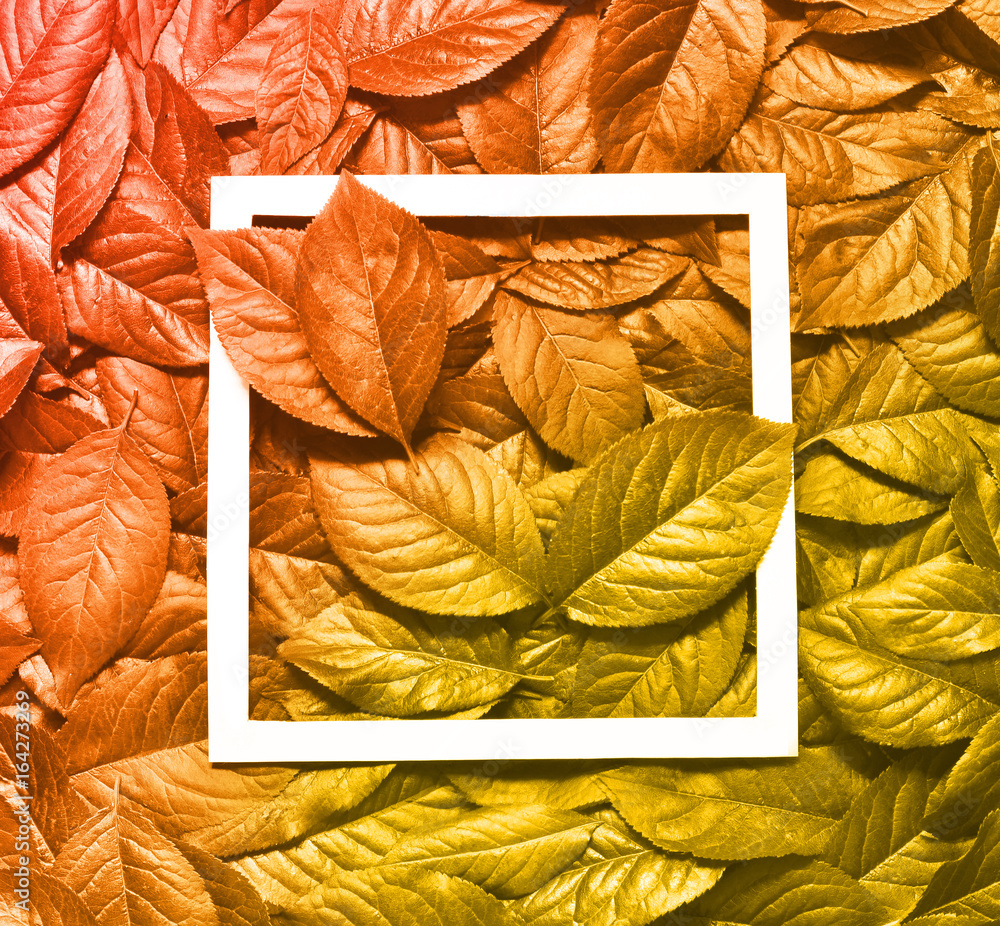 Creative layout made of leaves with paper card note. Flat lay. Nature concept