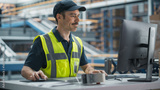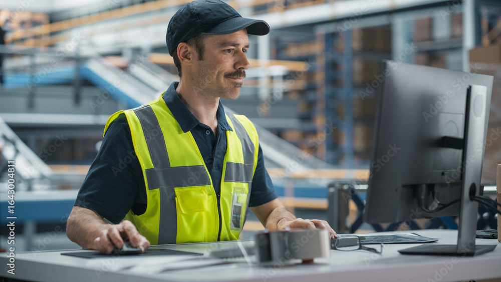 Male Senior Manager Checking Inventory On Desktop Computer In Warehouse Facility With Automated Conveyor Belt. Sorting Center Employees Carrying Boxes to Package Products And Shipping to Clients.