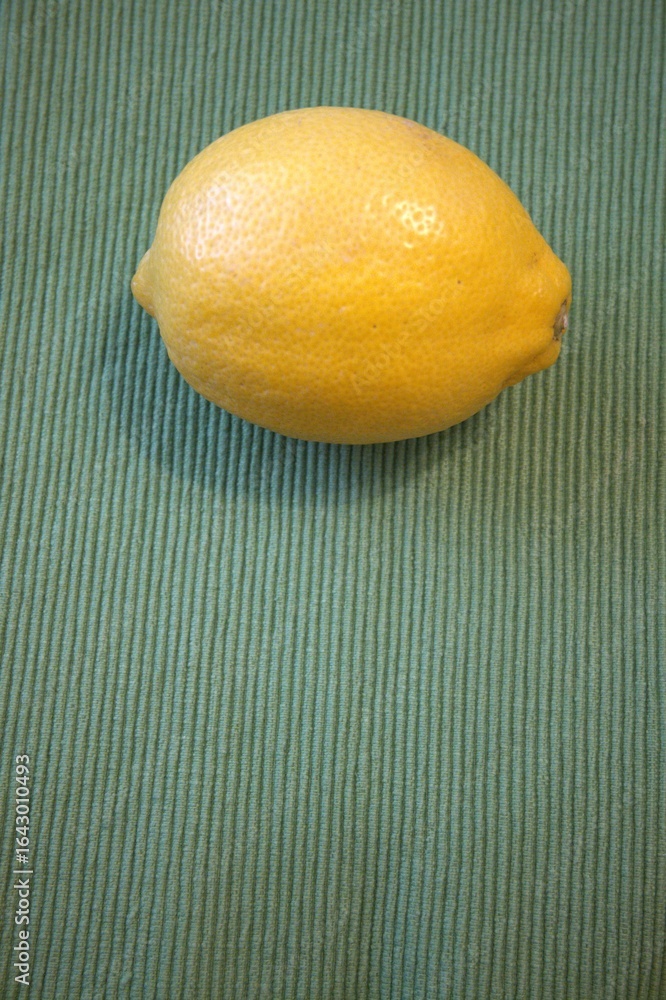 single whole lemon placed on a green background. Close-up shot with plenty of copy space for text or design.