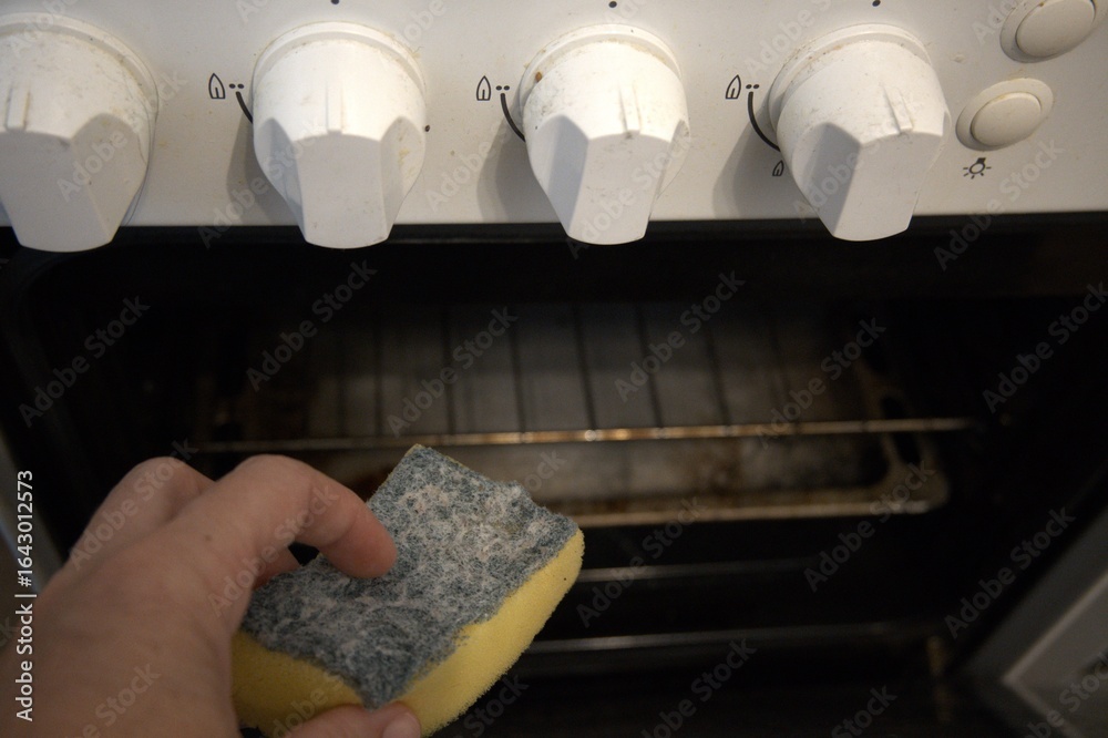 Close-up of a hand holding a sponge while cleaning the oven. Emphasizes cleanliness and maintenance.