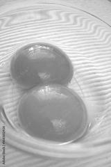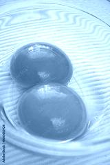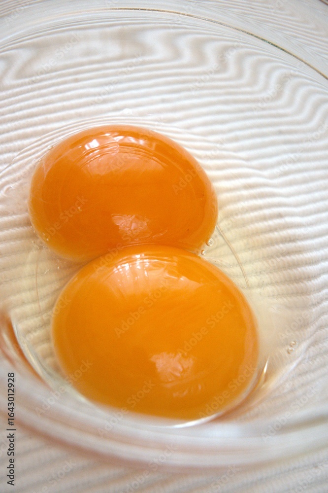 A close-up view of two raw egg yolks inside a transparent glass bowl. Ideal for cooking or food preparation themes.