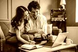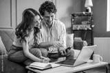 Couple discussing home finance while checking bills. They are checking financial documents and calculating family budget in living room.