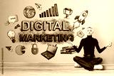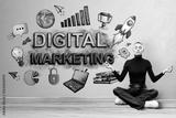 Woman meditating near digital marketing icons and sketches on blue wall background, symbolizing creativity, business strategy, and branding focus.