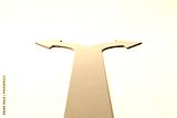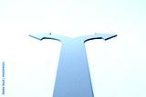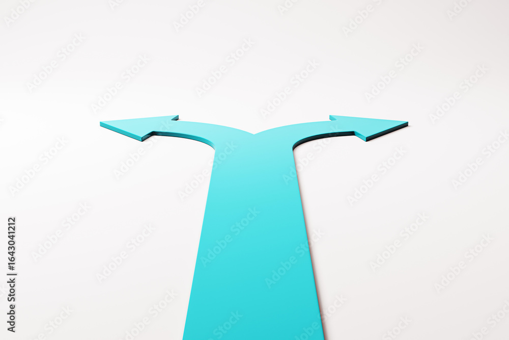 Abstract blue split arrow symbolizing a decision point or business strategy path on white gradient background representing future direction options. 3D Rendering