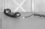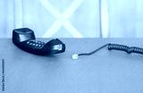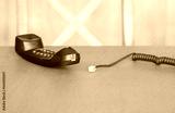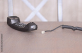 Corded telephone with disconnected cable resting on a wooden surface in a simple interior space