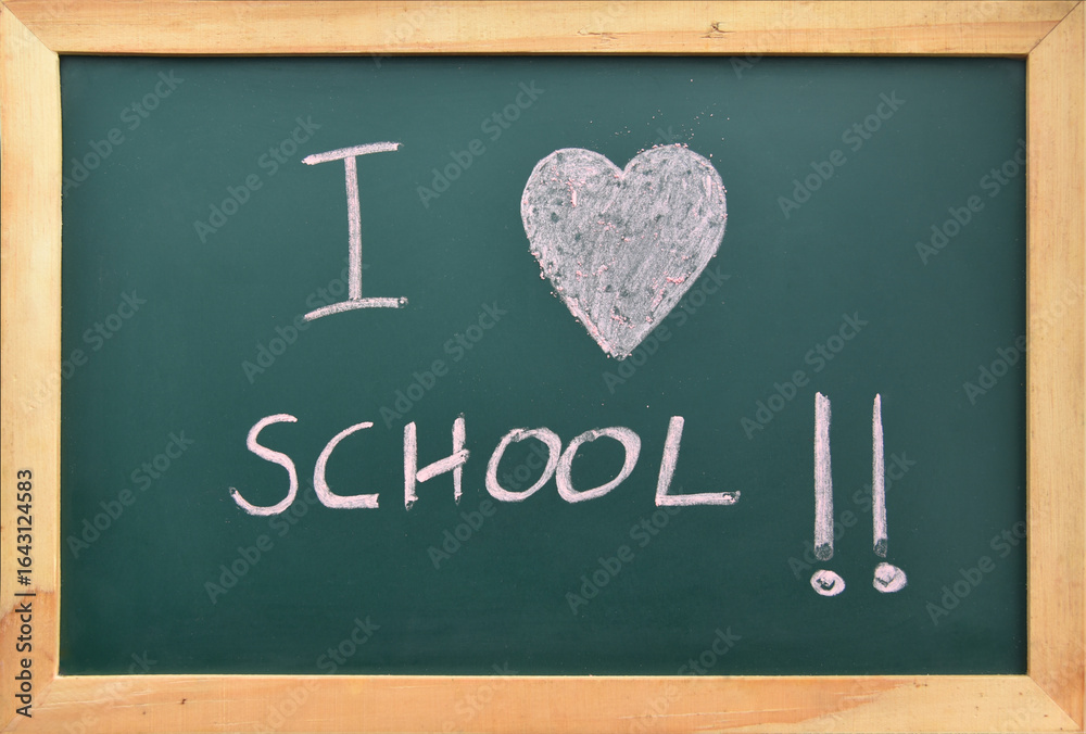 I love school hand written sign with heart in pink chalk, on blackboard with wood frame. Back to school concept. Successful student. Kids enjoying learning in school and thriving in educational system